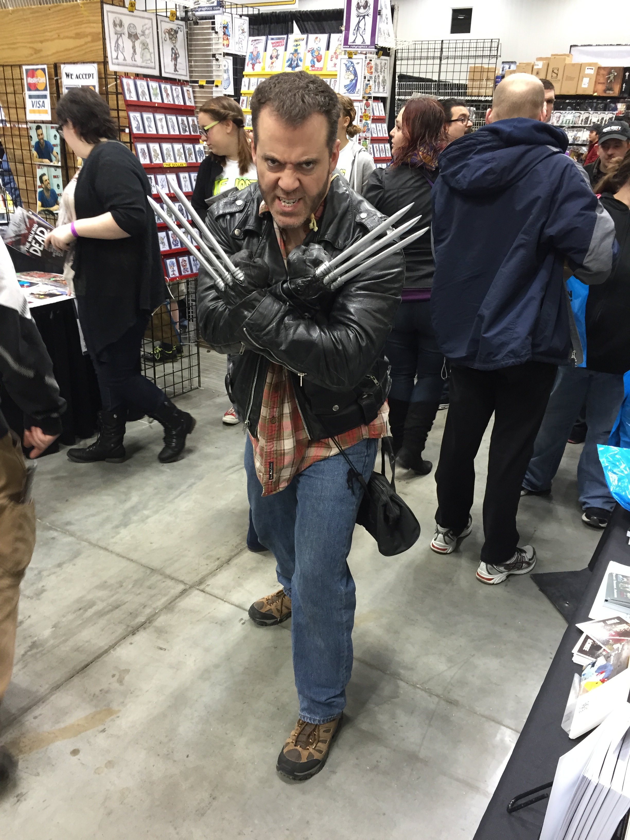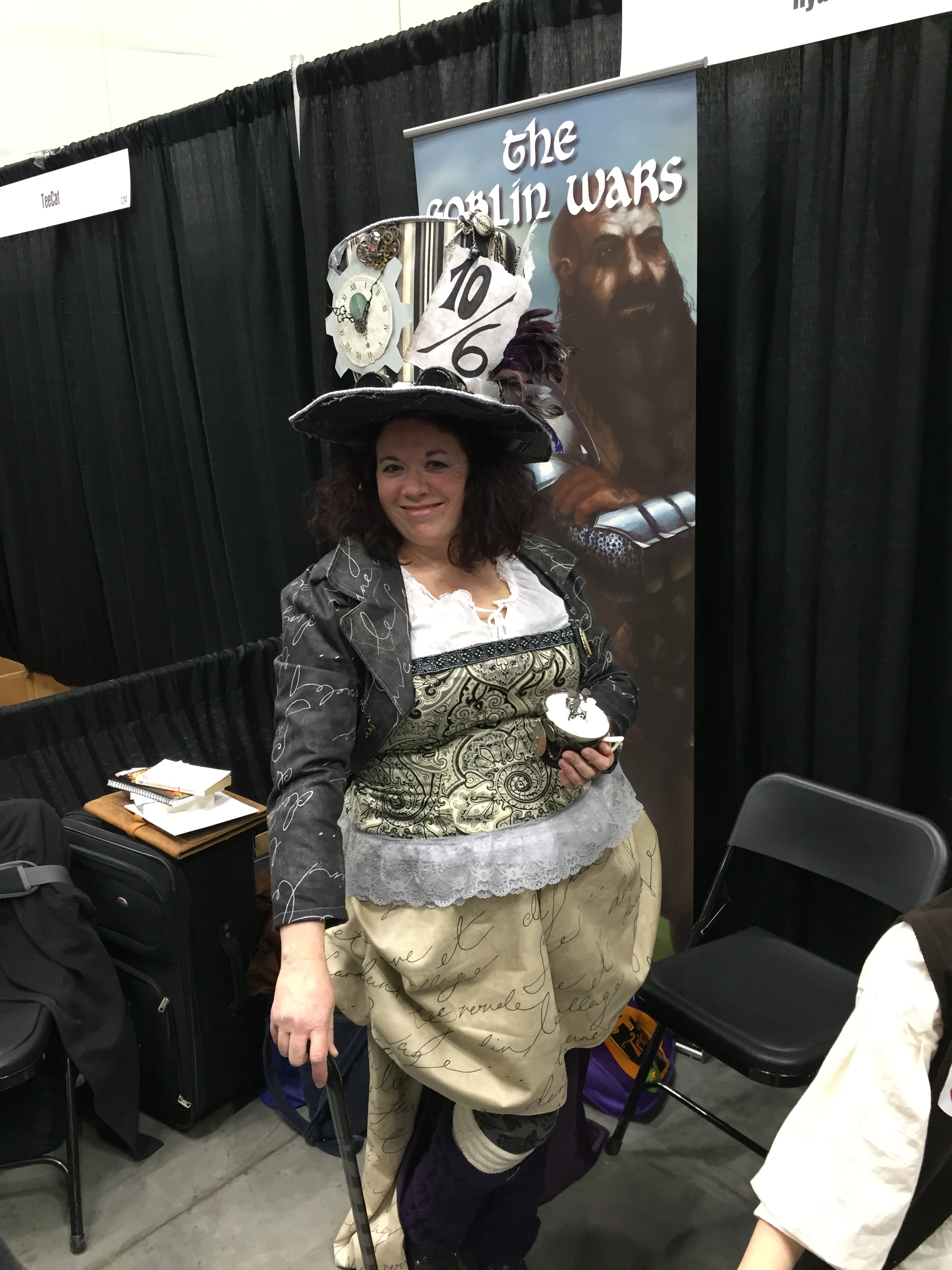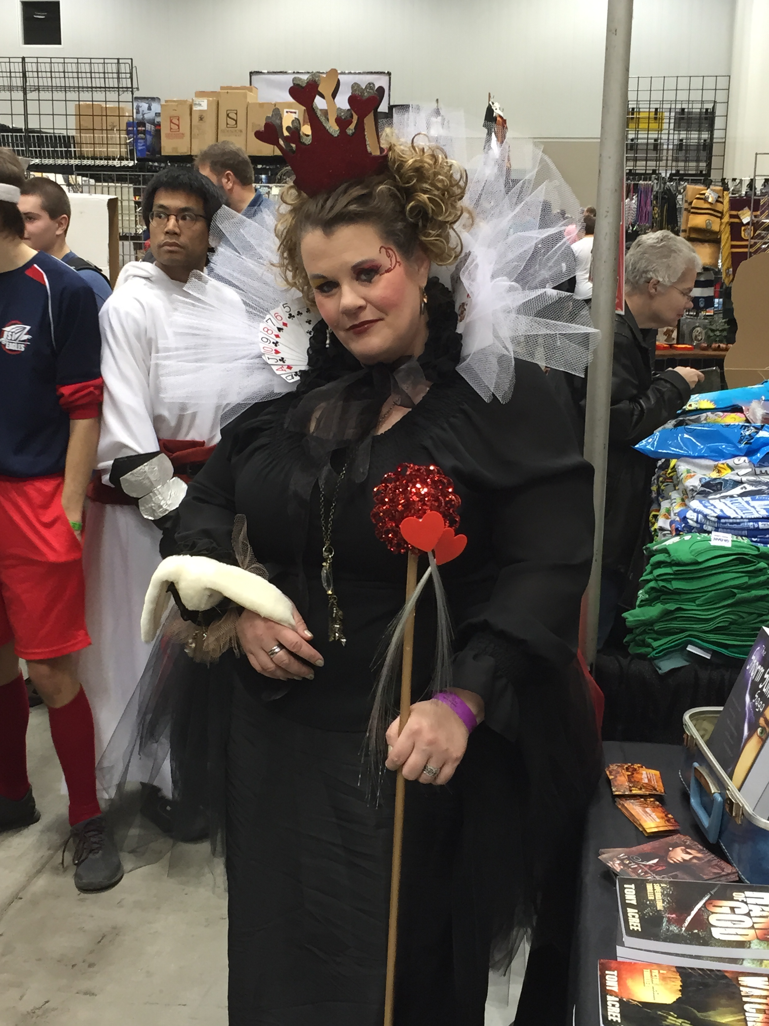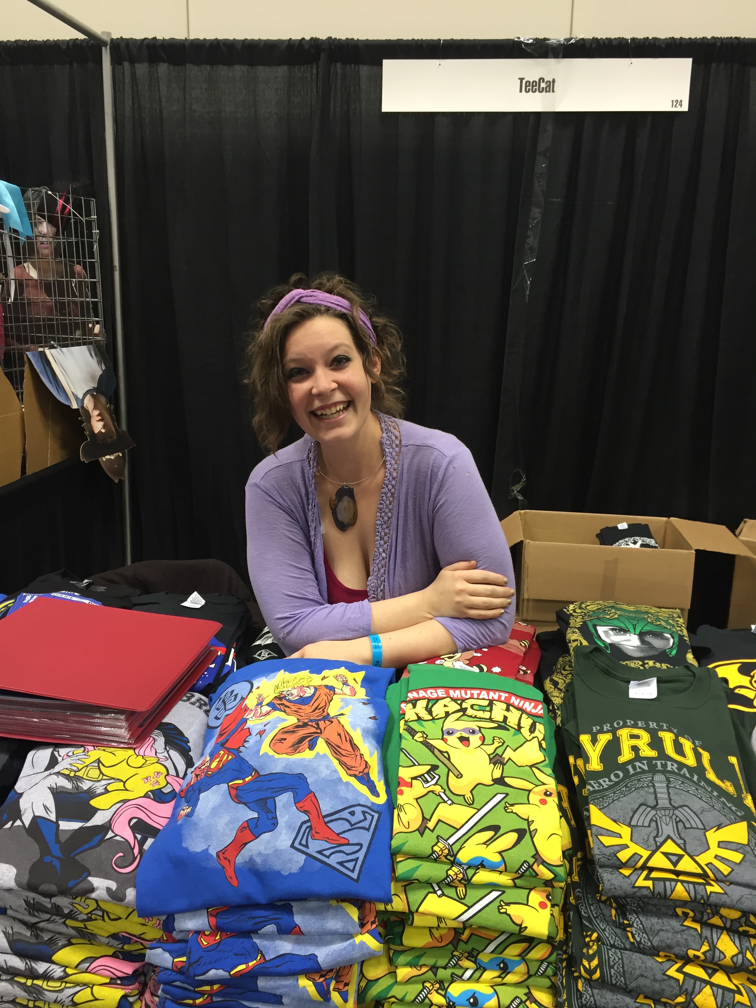 The booths around us were staffed by wonderful people, including Kristin, who ran the T-shirt booth next to us. She had her booth set up wonderfully, until her boss wanted it changed and *bam* his proposed changes didn’t work out. With help from Stu, Chris and myself, we helped get her up and running. Sorta.